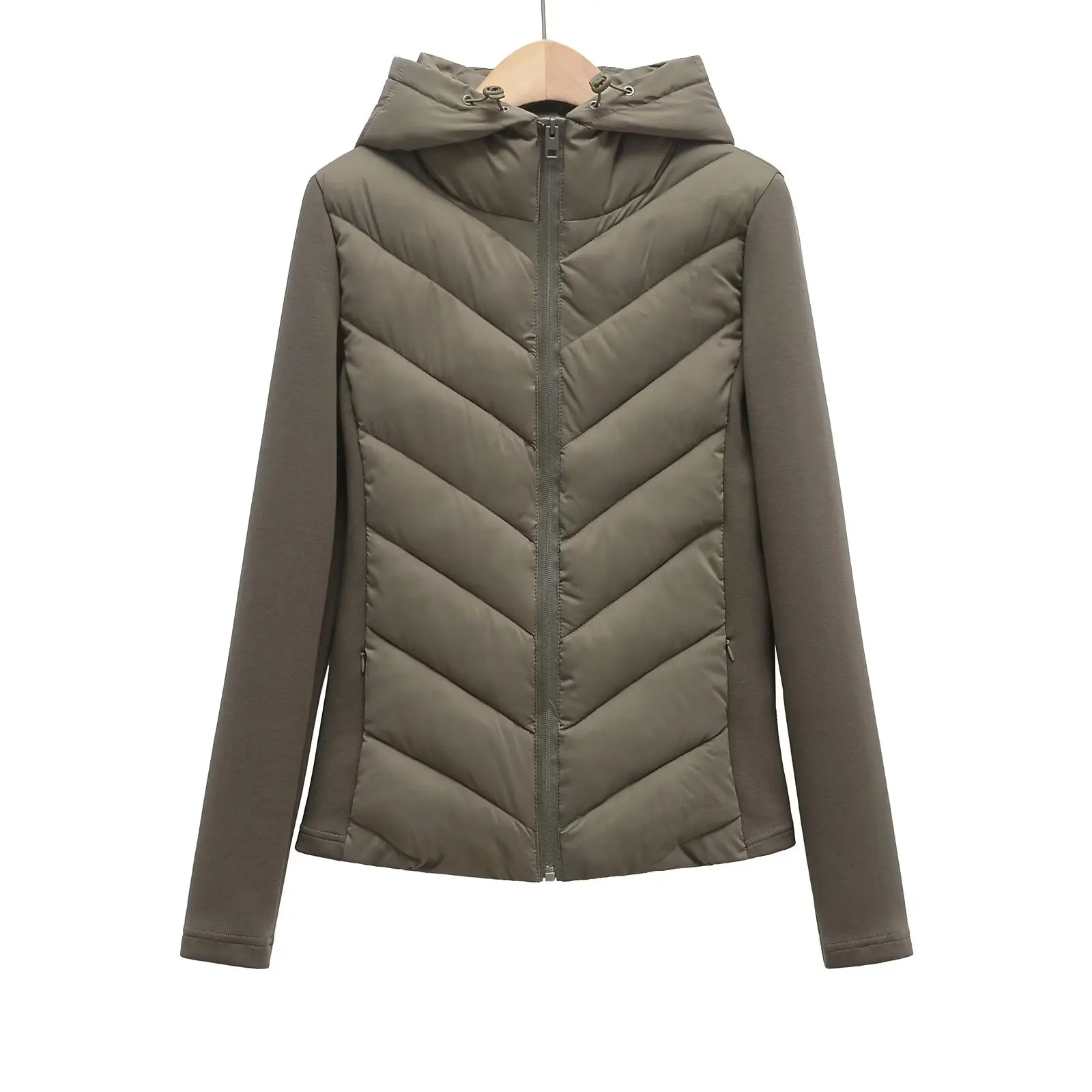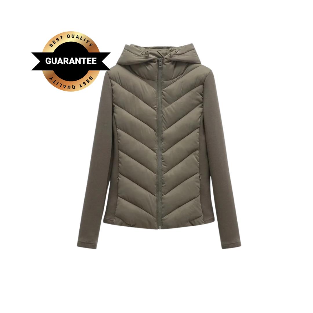 The army green base with subtle patchwork detailing gives a contemporary, sporty touch — perfect for casual outings, travel, or everyday wear. Designed with a full front zipper, cozy hood, and practical side pockets, it keeps you protected from chilly winds while maintaining an effortlessly chic look.