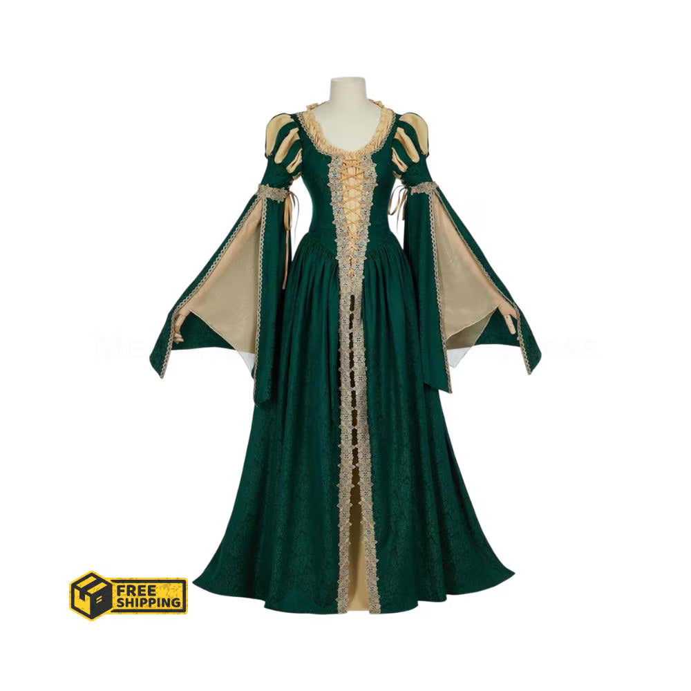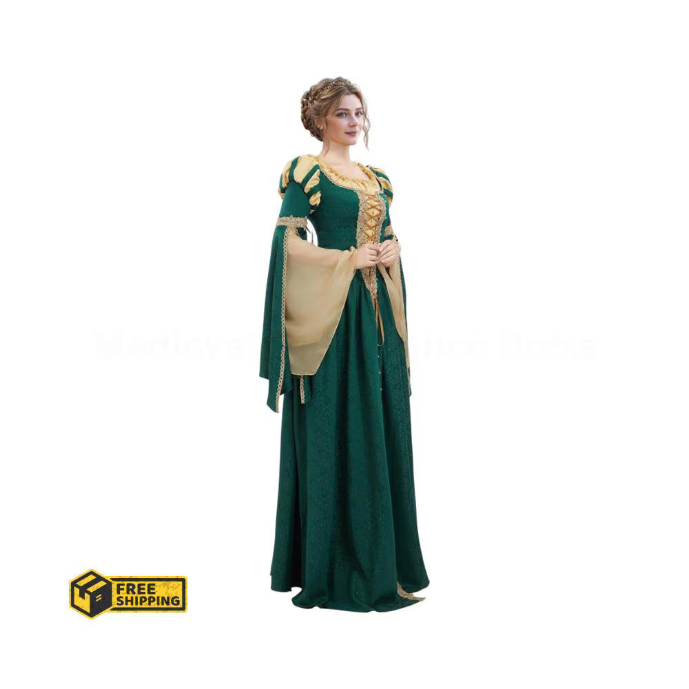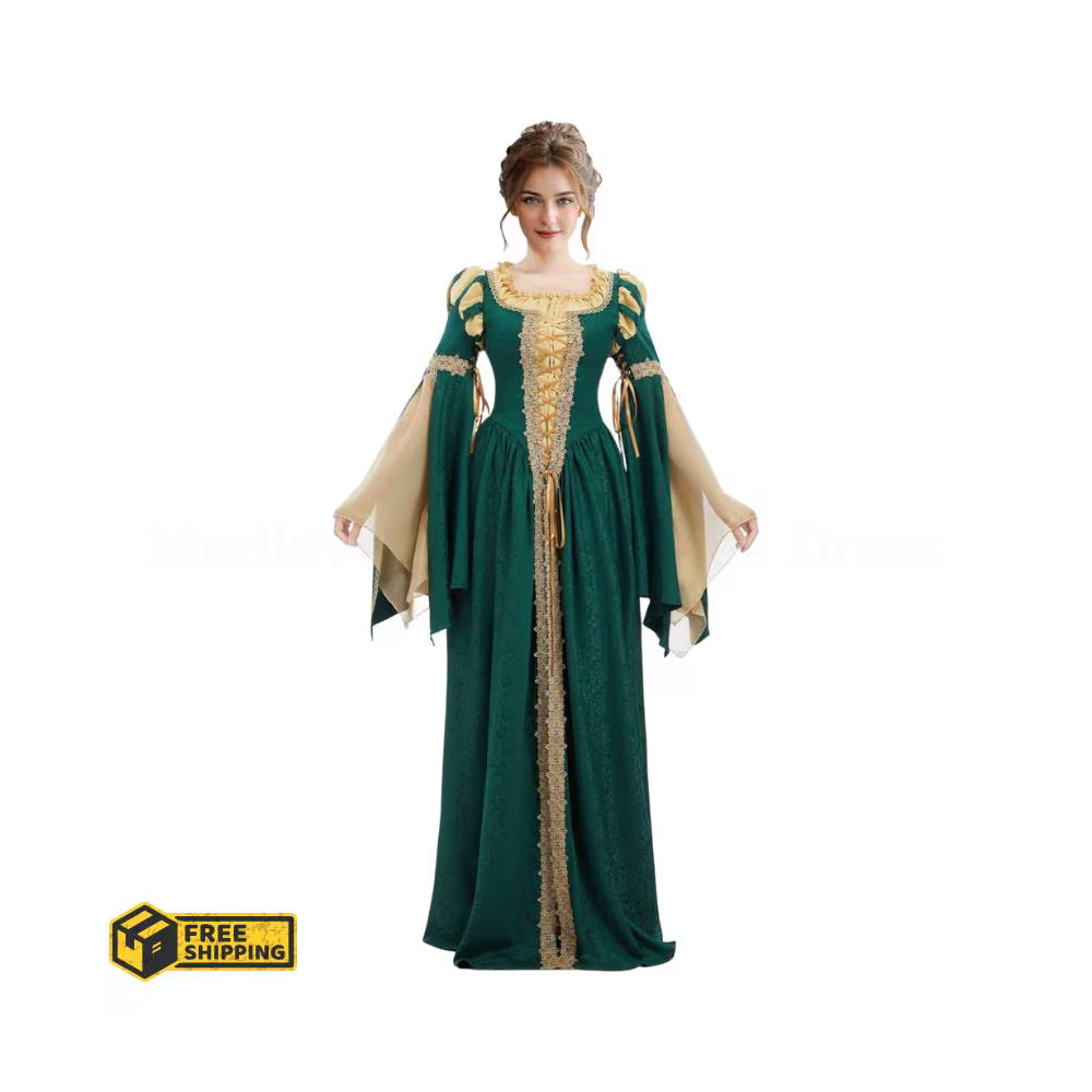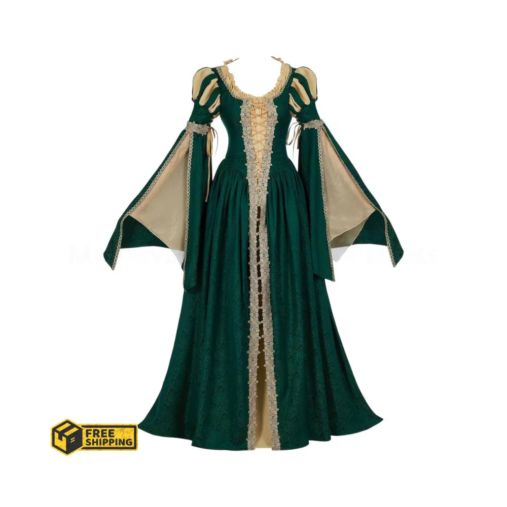 Women Medieval Renaissance Costume Pseudo-two-piece Vintage Renaissance Fair Dress with Wide Sleeves Lace