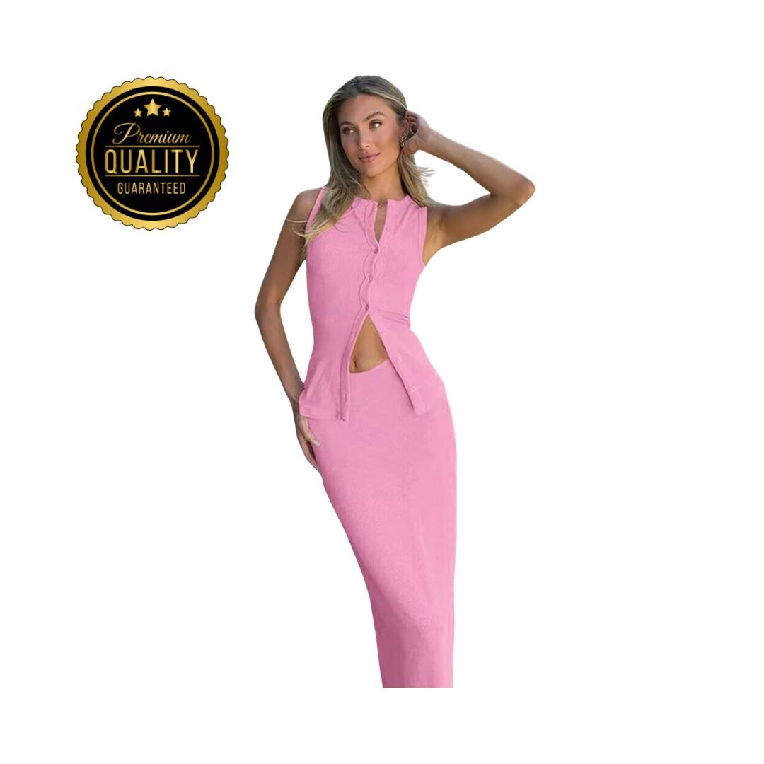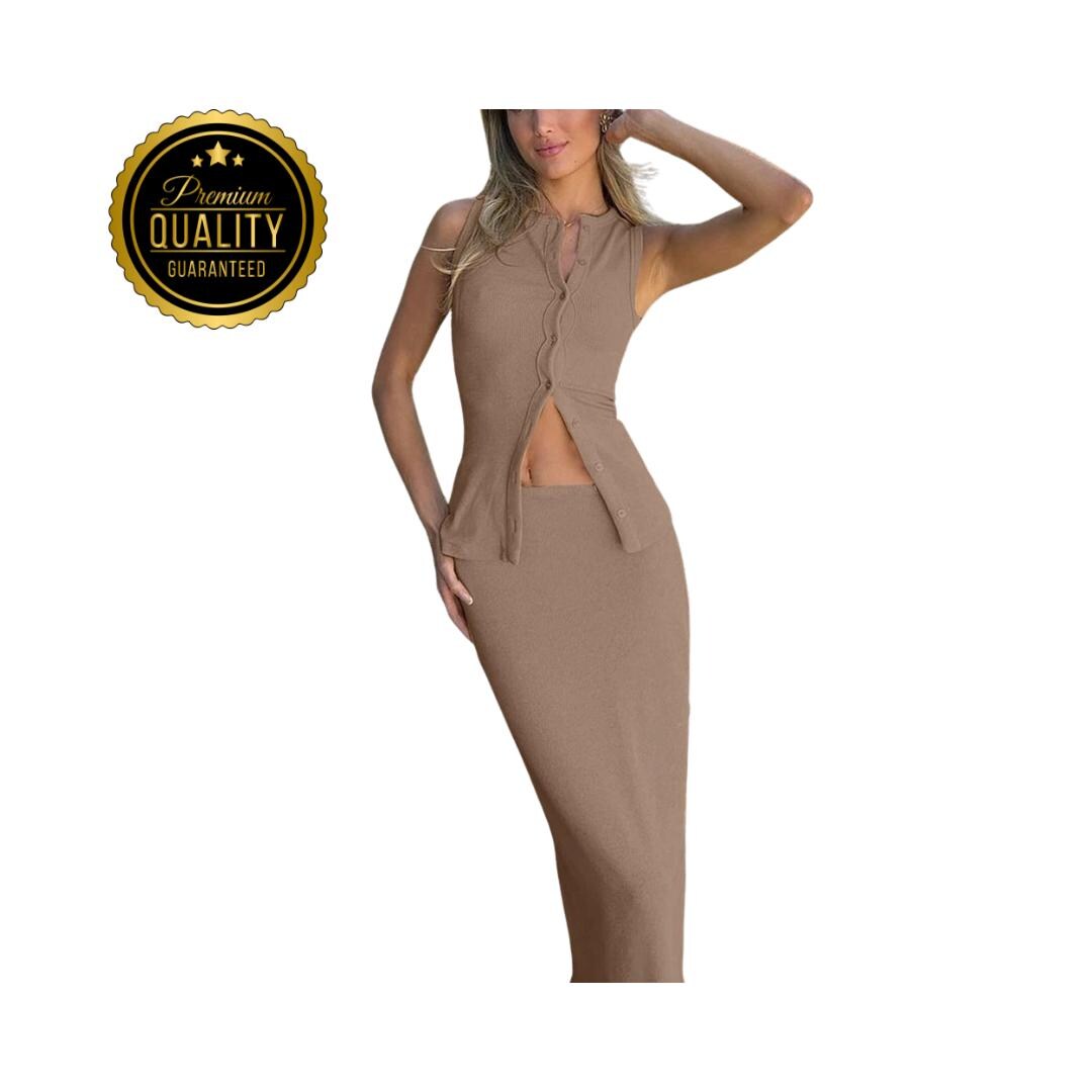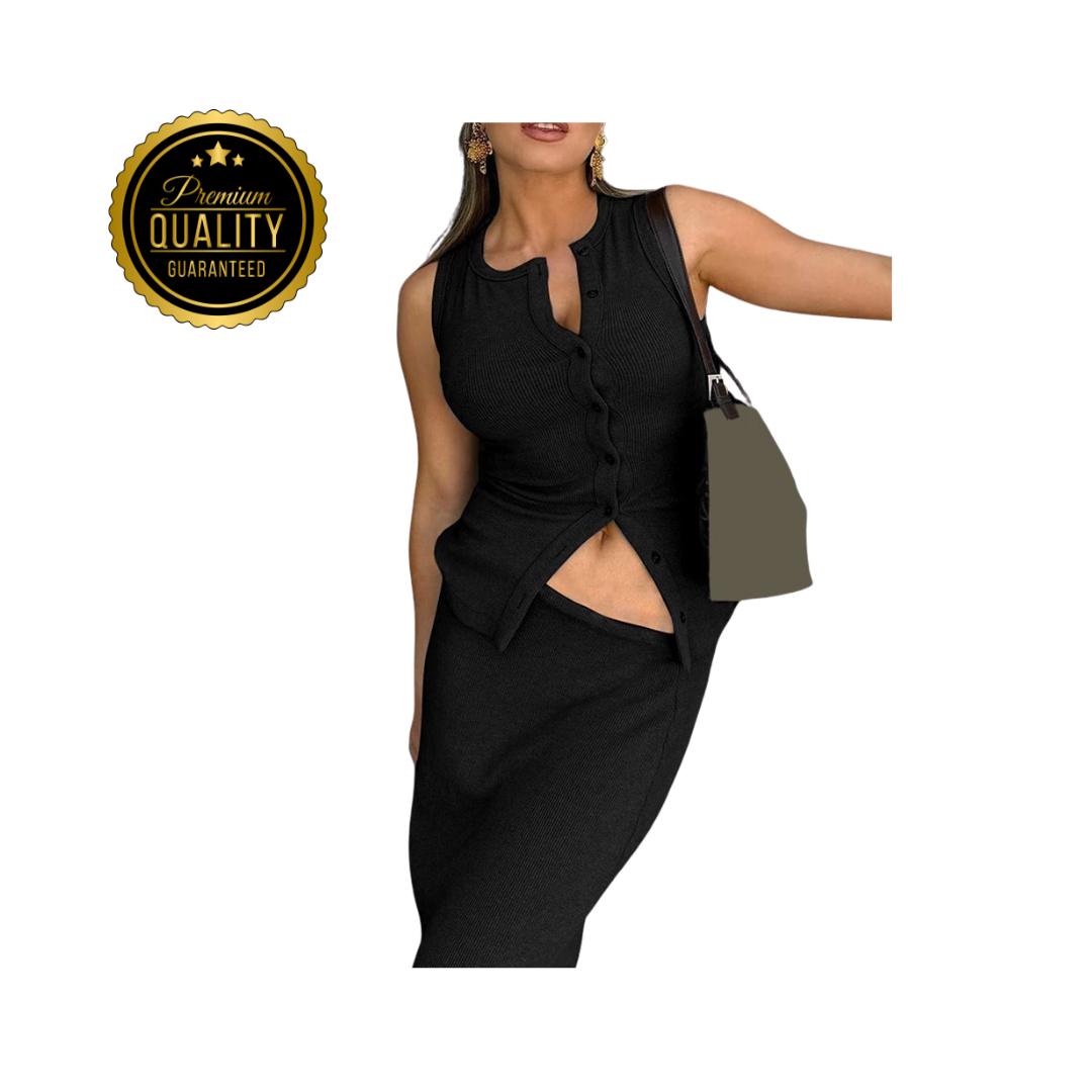 The single-breasted button-up top adds structure and elegance, while the ribbed texture provides a flattering fit. Perfect for brunches, vacations, parties, or casual outings, this two-piece set makes a confident statement wherever you go.
