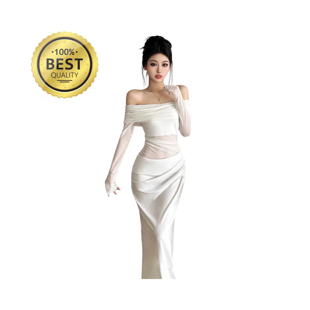 Sexy Dress Women 2025 Spring Patchwork Mesh Elegant Slash Neck Ruched Fit Chic Birthday Party Festival Vacation Vestidos