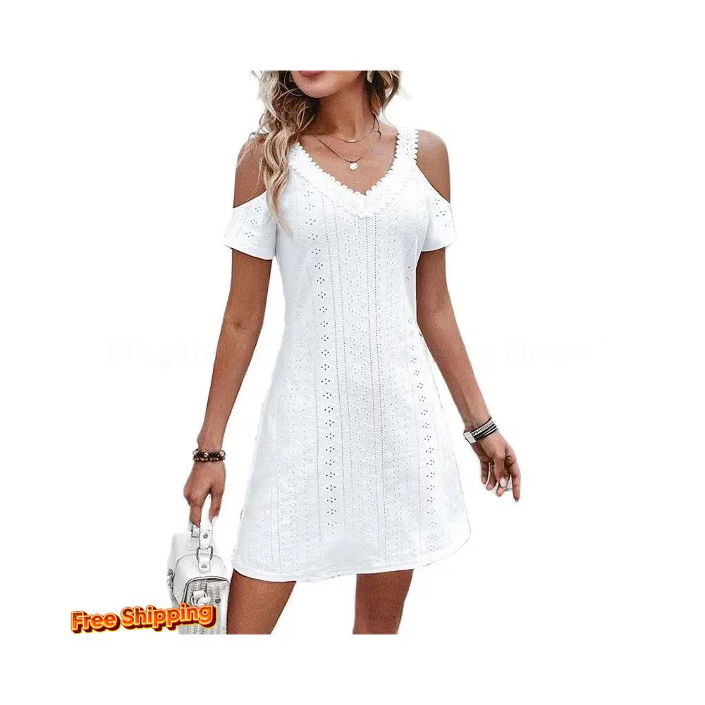 Summer Solid Off Shoulder V Neck White Dress Hollow Out Lace Short Sleeve Mini Dresses Elegant Party Women Clothing